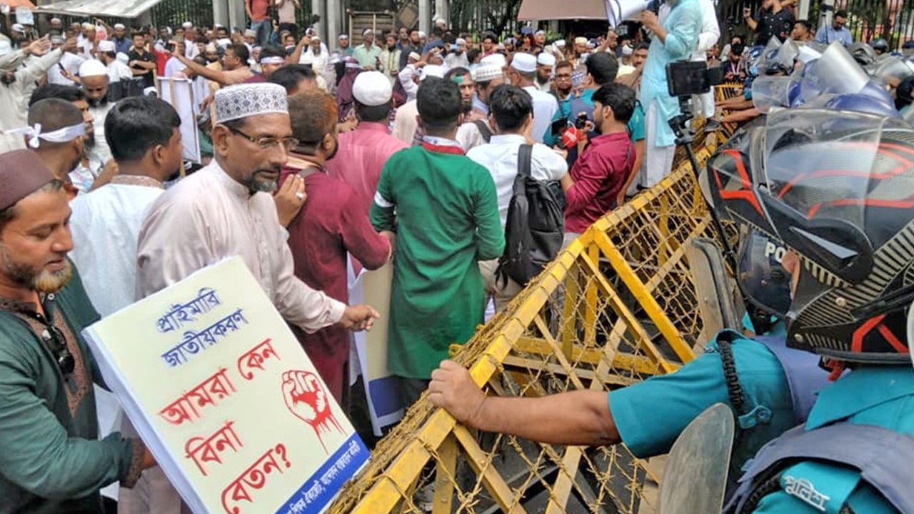 নতুন কর্মসূচি ঘোষণা দিয়েছে স্বতন্ত্র ইবতেদায়ি মাদরাসা শিক্ষক ঐক্যজোট। বুধবার (২২ অক্টোবর) সচিবালয়ে স্মারকলিপি দিতে গিয়ে শিক্ষা উপদেষ্টার সঙ্গে সাক্ষাৎ না হওয়ায় ক্ষোভ প্রকাশ করেন সংগঠনের নেতারা। এ ঘটনায় নতুন কর্মসূচি হিসেবে বৃহস্পতিবার সকাল ১১টায় জাতীয় প্রেস ক্লাবের সামনে বিক্ষোভ মিছিলের ঘোষণা দিয়েছেন তারা।